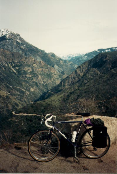 Kings Canyon National Park in California lies in two pieces. There is a piece outside the canyon at 6000'+ elevation with remarkable giant sequoias and there is the piece which contains part of Kings Canyon proper and the high peaks. The road connecting the two pieces runs through Sequoia National Forest land and "is not plowed" in the winter. But the road is actually plowed, at least from time to time. Furthermore, from the point where the locked gate blocks the road (at about 5800') the road is often clear of snow because the elevation is lower and the weather warmer. So the idea was to drive to near the gate, and then bicycle down into the canyon and then explore it in relative solitude before riding back up to my truck. I decided to go after some cool rainy weather in the nearby Central Valley, which was followed by warmer sunny weather.