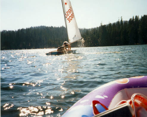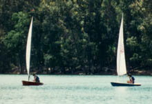 Here are Wedgie and Deadwood on Lexington Reservoir near Los Gatos, a fun place to sail where the water is usually pretty warm.