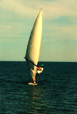 Me windsurfing in light winds in Baja, on Bahia Santa Maria south of San Felipe in the Sea of Cortez.