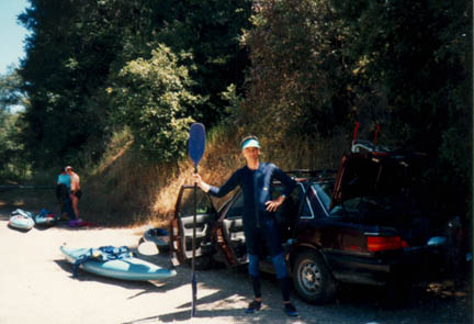 Here is Joel, before a run down a class II stretch of the Bear River in the general vicinity of the town of Colfax. This was a nice run but arranging the shuttle and takeout were a bit of a hassle. We know of no publically accessible takeout below the lower part of the run. The takeout near the middle has had vandalism problems from locals, so we asked permission from someone who had a place on the lake further downstream. Actually, I was elected to ask permission since I was the most-respectable looking of the lot of us, which is a scary thought. In any case, it was a nice run and worked well with a bike shuttle.