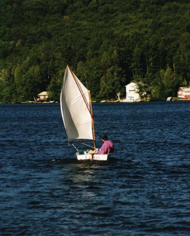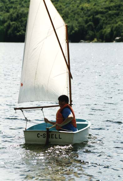 This is C-shell, an Optimist Pram-imitation boat. Yes, I know that that is the geekiest Unix name possible for a boat, but it was named this in 1974 (was there Unix then?) and the C is for Cleary. My brother Tim and I combined our assets and bought it for the mind-bogglingly huge sum of $50. At the time, our allowances were 9 cents and 7 cents a week (our ages in pennies) so my father arranged an installment plan for us to pay it off. I hope never to be so indebted again, at least relative to my income! C-shell is a pokey little boat but is simple to rig and sail. Two friendly grownups can squeeze into in, but mostly for comedy value. Many, many people have learned to sail in it!
