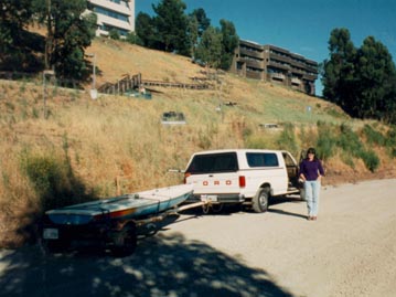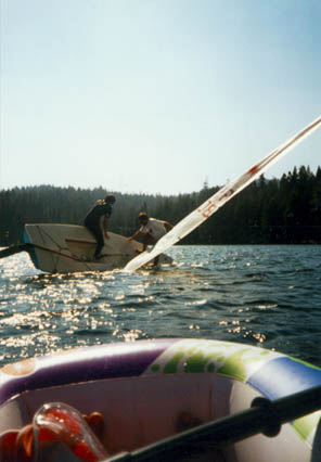 Deadwood spends a lot of time capisized, because righting it is so easy and fun. When it is capsized, the boat is so bouyant that the cockpit is above waterline so it is completely dry when righted. Here are Meg and I relaxing after having capsized the boat in the frigid waters of high-altitude Huntington Lake.