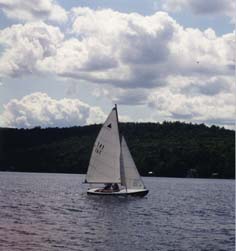 Dulcinea is our family's beloved sloop, of the Interlake design, which is popular in the midwest and was pretty much designed to sail on Lake Erie. It is a very stable boat and great fun to poke around in. Here is Dulcinea sailing up on Maidstone Lake.