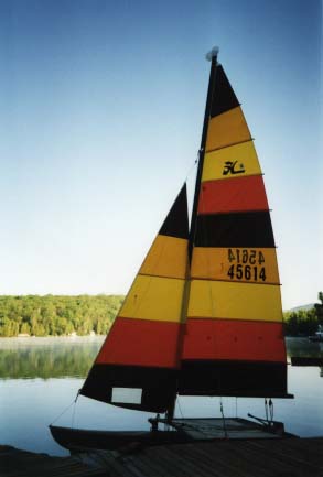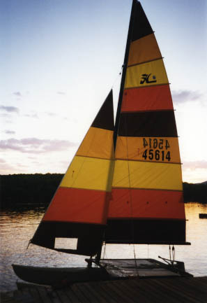 K and I found a cheap, lightly used Hobie 16 catamaran here in Fresno and decided to take it up to Vermont for my family to use up at camp. My folks used to be regular sailors, but the boat we have up at camp is pretty solid and stable (in other words, slow and boring) so interest in sailing has waned, particularly with some motorboats there for amusement. We're hoping everyone will like the Hobie and we think it is great fun. Here I am puttering with it in Vermont, and it tied up at sunset. Notice the very 1970's colors!