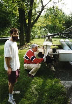 We did have to trailer the Hobie to Vermont, and it is much larger boat than Deadwood so that was a trip without much manoeverability. Here we are with about 50 feet of vehicle in Tappen, North Dakota on our way across, and here is my father in Ohio using some remarkable polishing compound to see what the hulls really look like.