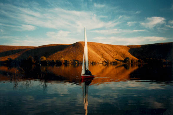This is Meg and Jan's wonderful boat, Wedgie, a Laser 2. Unfortunately, on this particular day on Los Banos Reservoir, there was absolutely no wind. But the light was nice and the company wonderful.