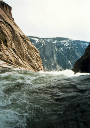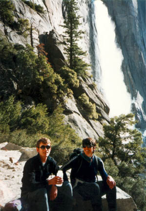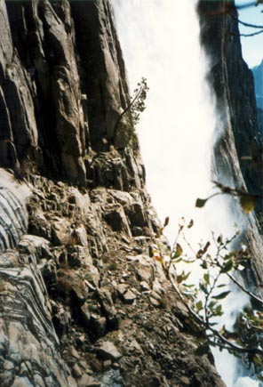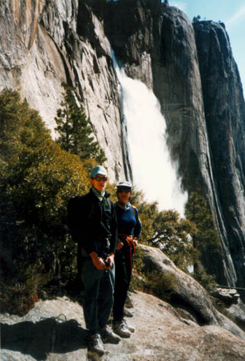 Via Aqua is a 6 pitch climb in Yosemite rated 5.7. It lies on the upper part of the wall to the left of Upper Yosemite Falls. The approach is up the Upper Yosemite Falls Trail, gaining a fair amount of elevation on the switchbacks. We got a reasonably early start from Fresno and were hiking up by about 7am. I hadn't been in the Valley since the January floods and was surprised that the effects weren't more noticable as we drove in. There was quite a lot of silt around and plenty of signs of recent construction and repair, though.