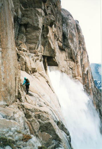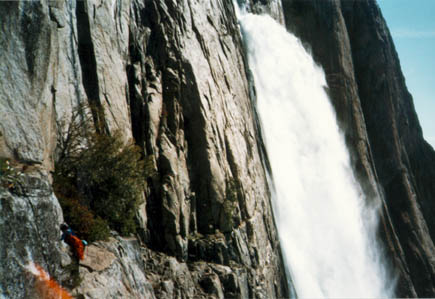 The approach ledge is a pretty spectacular little scramble, which starts from just before the uppermost switchbacks of the trail. Sam had been out the ledge before when he did Via Aqua a few years ago so we had no problem finding the start of the ledge. Interestingly, Steve Roper in the old Sierra Club Yosemite guidebook gives the approach ledge as a characteristic example of third class terrain. The ledge is spectacularly exposed above the falls and though for the most part the going is pretty straightforward, there are a few trickier spots. The left image is Nancy making an airy step across a void enroute to the base of the route, which is visible as the broken ledges in the middle of the picture. The middle image is a view including some of the falls below us and the right image is the start of the route. The route is somewhat but not completely protected from the spray of the falls by a buttress, as the climb starts in the left facing open book in the middle of the picture.