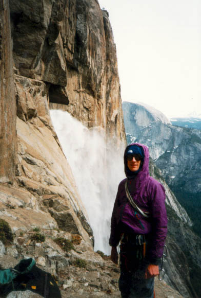 On the left, Sam is about to traverse across a ledge to set up a belay below what will prove to be a tricky strenuous chimney pitch. Nice views across the valley from here, including of course Half Dome. In the middle is Sam moving the belay over. It was a little windy and there was some spray here. And on the right, Nancy follows Sam. It was pretty interesting being near the falls and exposed here.
